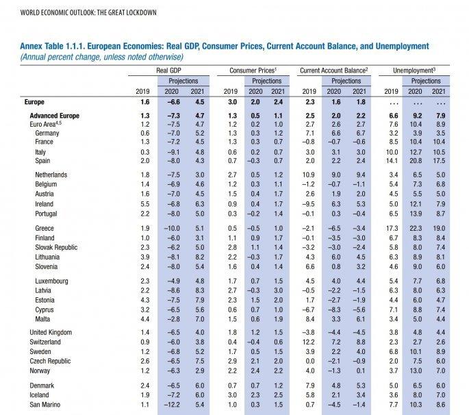 Τέλος αναφορικά με την ύφεση στην Ευρωζώνη, οι προβλέψεις του ταμείου αναφέρουν ότι θα είναι -7,5%. Μάλιστα αναφέρει ότι στην Ιταλία θα φτάσει το -9,1%, στην Ισπανία το -8%, στη Γαλλία το -7,2% και τη Γερμανία το -7%