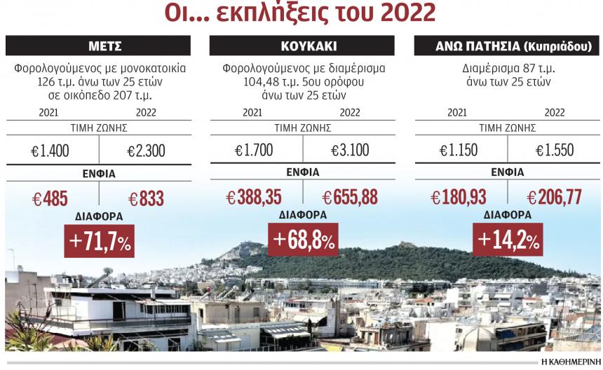 Για παράδειγμα, φορολογούμενος με διαμέρισμα στο Κουκάκι 104,48 τ.μ. πέμπτου ορόφου άνω των 25 ετών πλήρωσε το 2021 ΕΝΦΙΑ ύψους 388,35 ευρώ. Για το 2022 θα πρέπει να καταβάλει 655,88 ευρώ. Δηλαδή, ο φόρος αυξήθηκε κατά 68,8%. ΕΝΦΙΑ: Ανακούφιση για πολλούς, ψυχρολουσία για λίγους-2