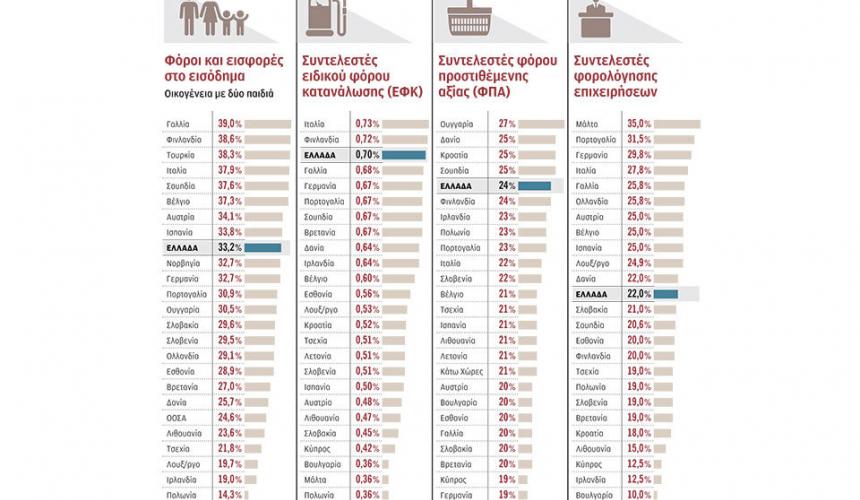 Πρωταθλητισμό στις επιβαρύνσεις τόσο στην άμεση φορολογία όσο και στην έμμεση κάνει η χώρα μας, σε σύγκριση με τις περισσότερες ευρωπαϊκές και σε κάθε περίπτωση στη βαλκανική ζώνη, όπως προκύπτει από τα στατιστικά στοιχεία του ΟΟΣΑ, της Ε.Ε. και του tax foundation. Ωστόσο, η χώρα διατηρεί μια θετική πρωτιά για τους μετόχους των επιχειρήσεων, καθώς ο φόρος στη διανομή μερίσματος είναι ο χαμηλότερος στην Ε.Ε. Βέβαια, και σε αυτή την περίπτωση υπάρχουν χώρες που δεν επιβάλλουν φόρο στη διανομή ή γενικότερα η φορολογία τόσο σε επίπεδο διαχείρισης όσο και σε διαδικαστικά θέματα ελκύει τους επενδυτές.