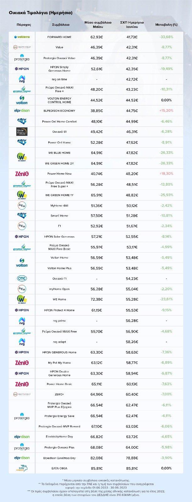 Aναλυτικά η λίστα με τα οικιακά τιμολόγια για τον Ιούνιο από τους παρόχους καθώς και οι μεταβολές στις τιμές.