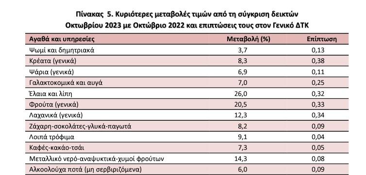 Σύμφωνα με την ΕΛΣΤΑΤ, οι ανατιμήσεις στα τρόφιμα τον Οκτώβριο του 2023 εμφάνισαν αύξηση, σε ετήσια βάση, της τάξεως του 9,9%. Πρωταθλητές των ανατιμήσεων την ίδια περίοδο ήταν τα έλαια-λίπη με 26% καθώς και τα φρούτα με 20,5%. Διψήφια αύξηση εμφάνισαν επίσης οι κατηγορίες «μεταλλικό νερό- αναψυκτικά- χυμοί φρούτων» με 14,3% καθώς και τα λαχανικά με 12,3%.