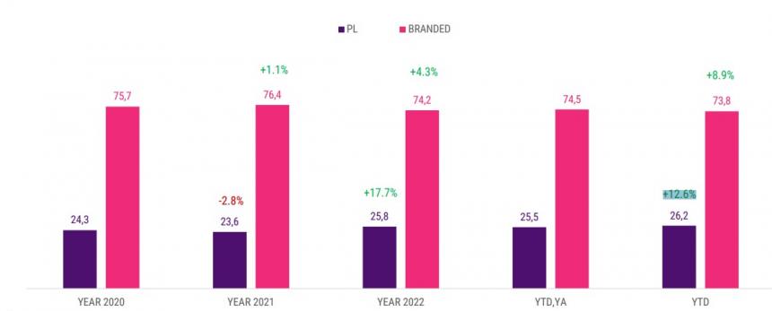 Στα τρόφιμα το μερίδιο των pl φτάνει 26,6% έναντι 26,2% πέρσι και 24,3% το 2021.