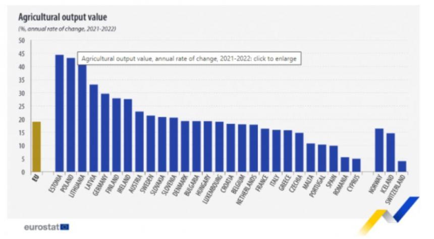 Το κόστος εισροών για τον αγροτικό τομέα της ΕΕ (για ενδιάμεση κατανάλωση) αυξήθηκε 22% το 2022 και η ακαθάριστη προστιθέμενη αξία του αυξήθηκε 15%.