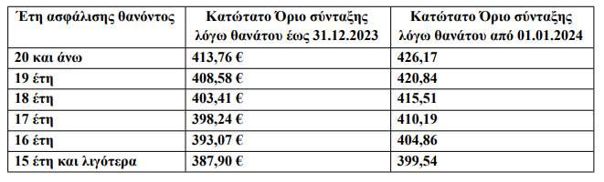 Το κατώτατο όριο της σύνταξης λόγω θανάτου (χηρείας και ορφανικές) το οποίο έως 31.12.2023 ανερχόταν σε 387,90 ευρώ, αυξάνεται από 1.1.2024 αυτόματα σε 399,54 ευρώ.
