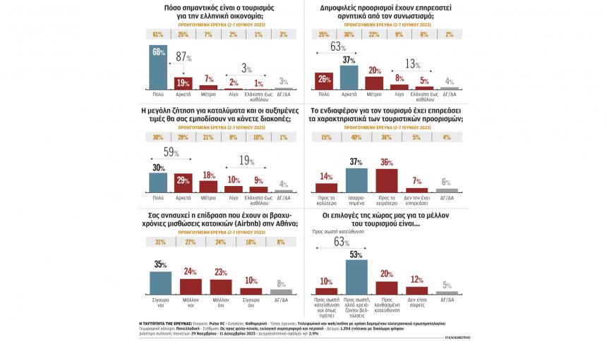Το 87% των συμμετεχόντων χαρακτηρίζει τον συγκεκριμένο πυλώνα ανάπτυξης “αρκετά ή πολύ” σημαντικό, με το ποσοστό όσων απάντησαν “πολύ” να ενισχύεται από 61% τον Ιούνιο του 2023 σε 68% τον Δεκέμβριο». «Επιπλέον, η θετική αξιολόγηση των επιλογών που γίνονται για το μέλλον του τουρισμού καταδεικνύει μια γενικότερη εμπιστοσύνη από σχεδόν δύο στους τρεις πολίτες – αν και συγχρόνως υπάρχει αναγνώριση, από την πλειονότητα των συμμετεχόντων, της ανάγκης για βελτιώσεις. Μόνο ένας στους πέντε χαρακτηρίζει την κατεύθυνση των επιλογών λανθασμένη», επισημαίνει.
