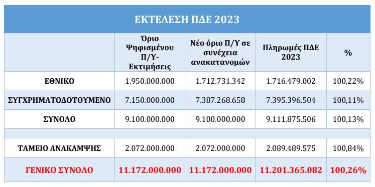 Όπως δείχνουν τα στοιχεία, το 2023 εκτελέστηκε το Πρόγραμμα Δημοσίων Επενδύσεων (ΠΔΕ) στο σύνολό του (ποσοστό 100%), ενισχύοντας την πραγματική οικονομία με συνολικούς πόρους ύψους 11,2 δισ. ευρώ, αυξημένους κατά 176 εκατ. ευρώ σε σύγκριση με το 2022.