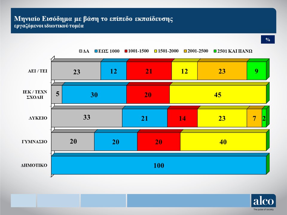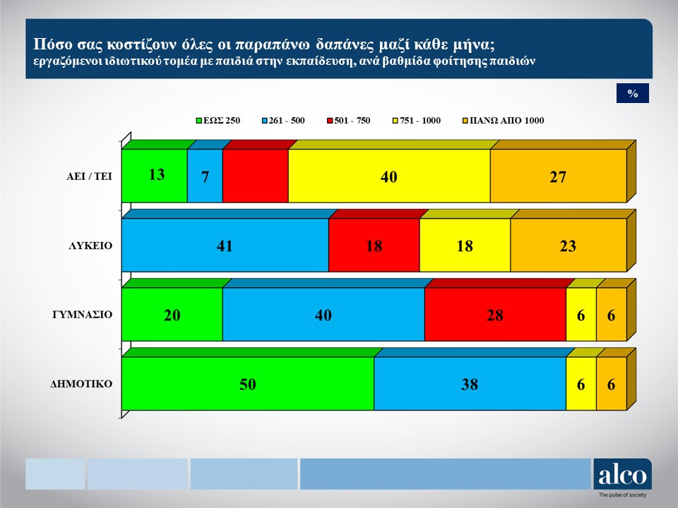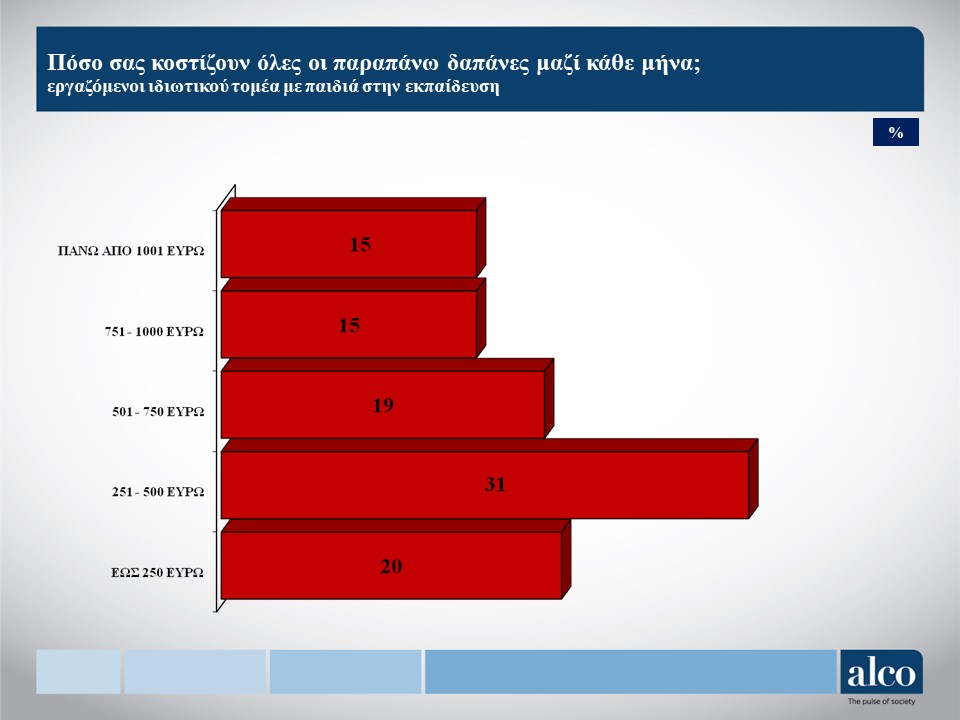 - Ένας στους δύο εργαζόμενους του ιδιωτικού τομέα (49%) καταβάλει τουλάχιστον 500 ευρώ σε εκπαιδευτικές δαπάνες για τα παιδιά του σε μηνιαία βάση, ενώ το 30% ξοδεύει τουλάχιστον 750 ευρώ, δηλαδή σχεδόν τουλάχιστον έναν μηνιαίο κατώτατο μισθό.