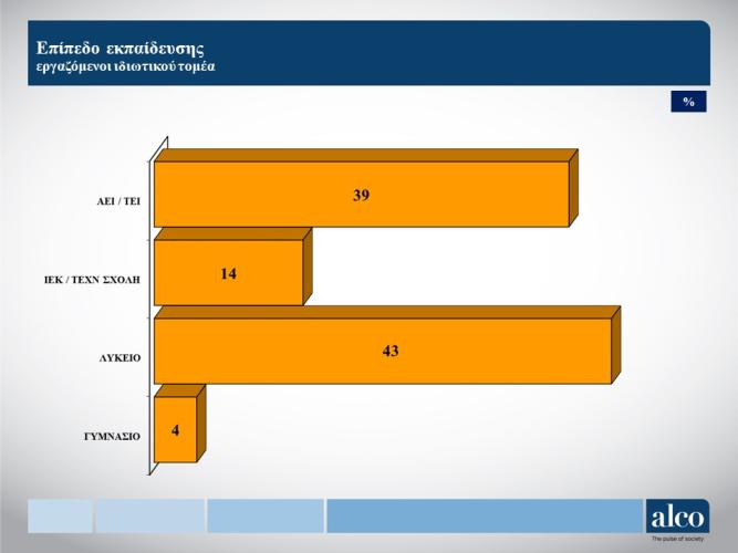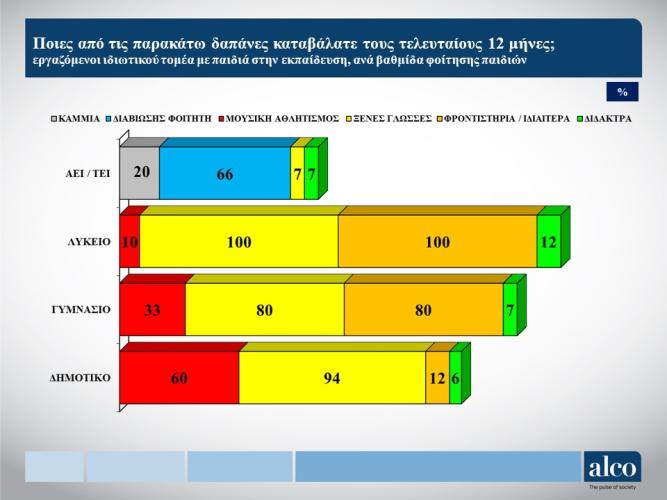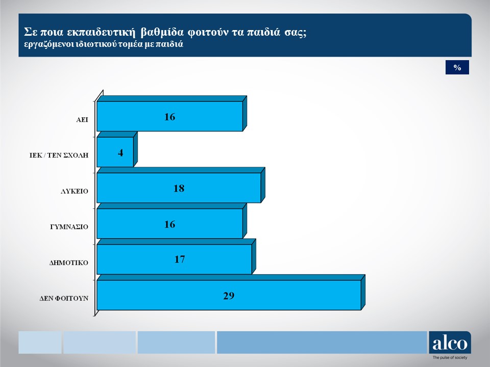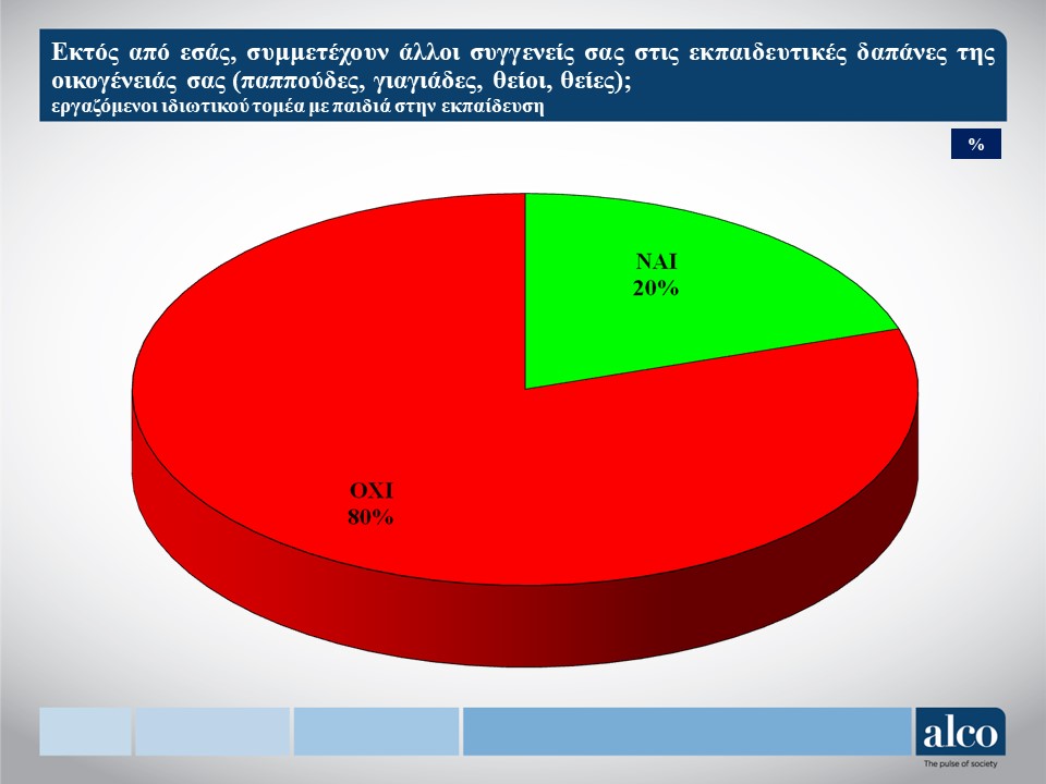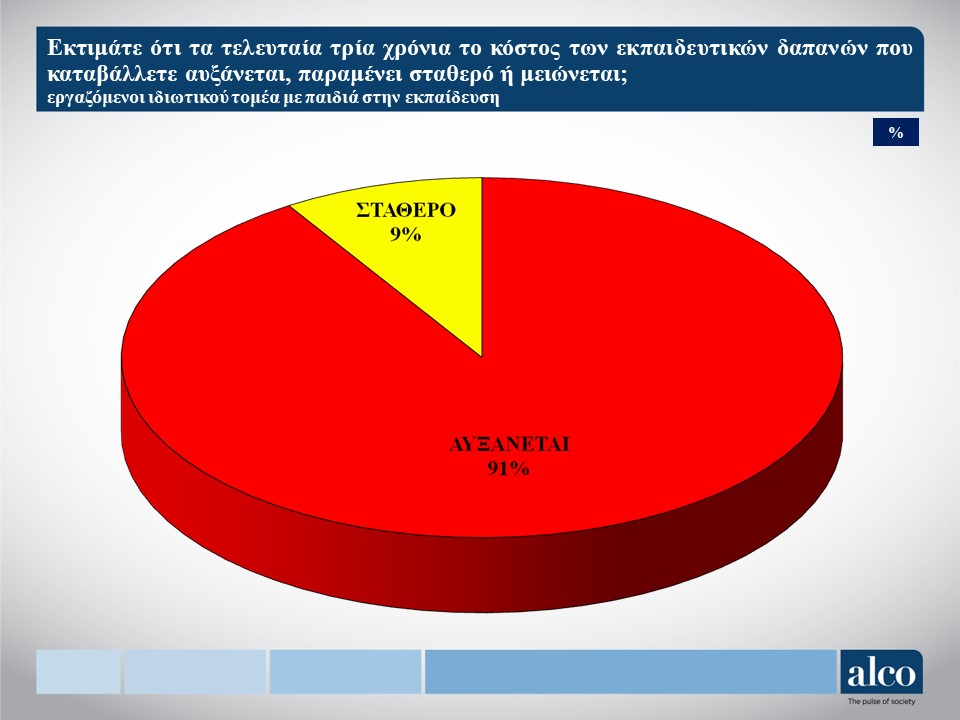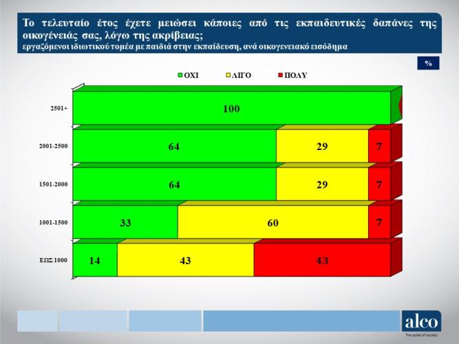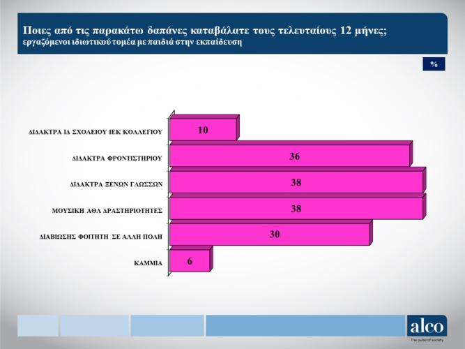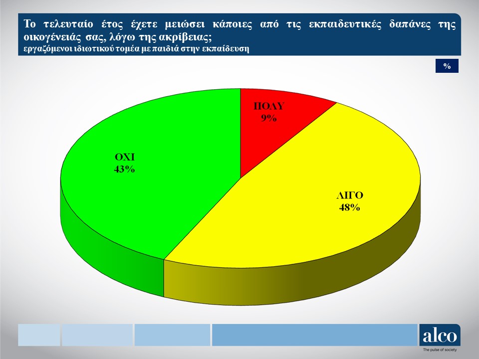 - Οι εργαζόμενοι του ιδιωτικού τομέα με παιδιά εκτιμούν ότι οι ιδιωτικές δαπάνες για την εκπαίδευση τους είναι ανελαστικές και δύσκολα μπορούν να μειωθούν. Έτσι, εμφανίζεται μόνο ένα 9% να δηλώνει ότι τις μείωσε σημαντικά, ένα 48% λίγο και ένα 43% καθόλου.