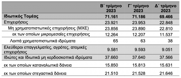 Η ονομαστική αξία των υπό διαχείριση δανείων προς ελεύθερους επαγγελματίες, αγρότες και ατομικές επιχειρήσεις μειώθηκε κατά 542 εκατ. ευρώ έναντι του προηγούμενου τριμήνου και διαμορφώθηκε σε 9.051 εκατ. ευρώ στο τέλος του δ ́ τριμήνου του 2023.