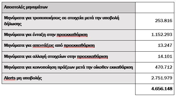 Παράλληλα, η ΑΑΔΕ, ικανοποιώντας σχετικό αίτημα των λογιστών, για πρώτη φορά φέτος ανέλαβε τη δέσμευση να ενημερώνει εγκαίρως τους πολίτες για ο,τιδήποτε αφορά την υποχρέωση υποβολής της δήλωσής τους, και ιδίως για μεταβολές στα στοιχεία που αποστέλλουν δημόσιοι και ιδιωτικοί φορείς μετά την υποβολή των δηλώσεων. Συνεπής στη δέσμευση αυτή, η ΑΑΔΕ έχει αποστείλει μέχρι σήμερα συνολικά πάνω από 4,6 εκατομμύρια μηνύματα. Ειδικότερα, έχουν αποσταλεί: