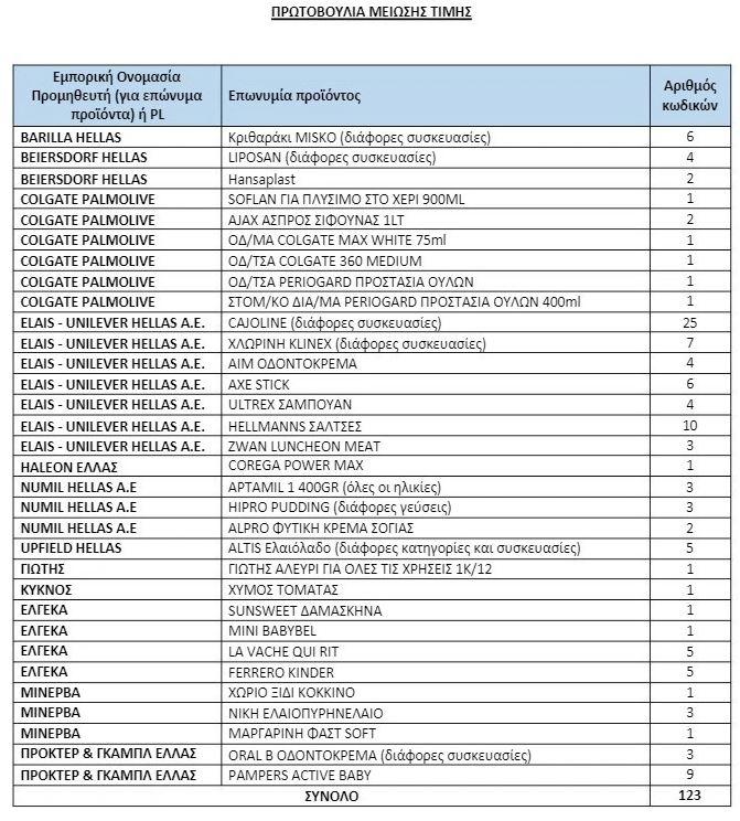 Συνολικά 123 προϊόντα, τα οποία εμφανίζουν μειώσεις από 6% έως 15% έχουν ενταχθεί, σύμφωνα με το υπουργείου Ανάπτυξης, στη νέα πρωτοβουλία που ξεκίνησε πριν από λίγες μέρες στα σούπερ μάρκετ, με στόχο την αποκλιμάκωση των τιμών.