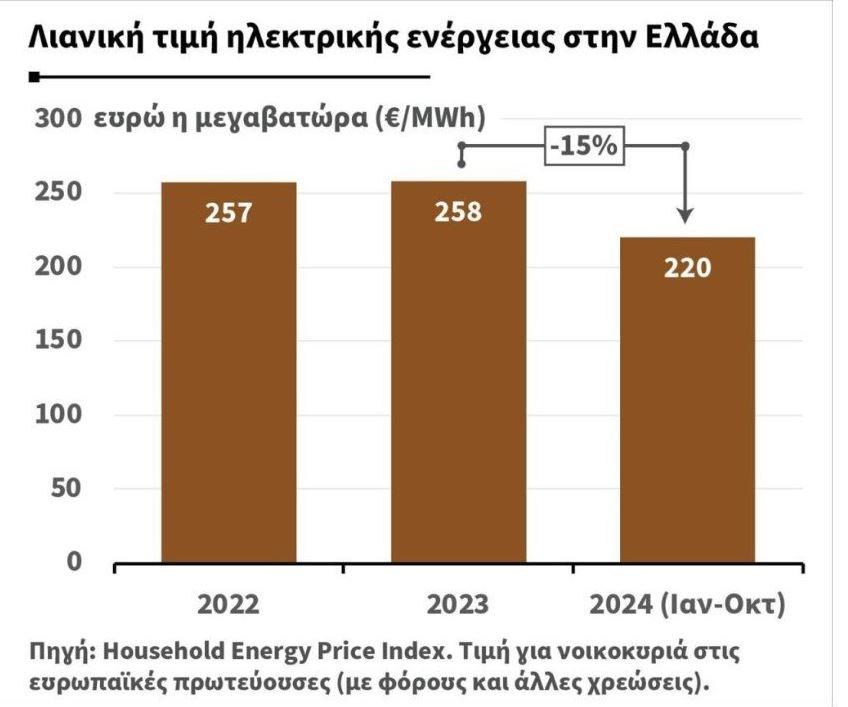 Σε κάθε περίπτωση, υπενθυμίζεται πως οι τιμές του ρεύματος για τον οικιακό καταναλωτή το 2024 είναι χαμηλότερες σε σχέση με το 2023 (παρατίθεται σχετικό γράφημα).