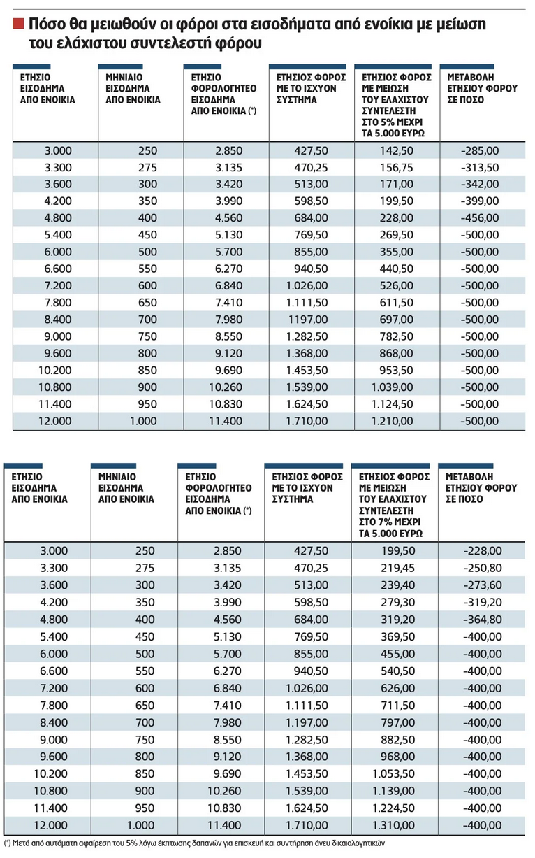 Από την εφαρμογή αυτού του «σεναρίου» και υπό την προϋπόθεση ότι δεν θα γίνουν άλλες παρεμβάσεις στους συντελεστές για τα υψηλότερα κλιμάκια φορολογητέου εισοδήματος, όλοι οι ιδιοκτήτες ακινήτων με ετήσια φορολογητέα ποσά ενοικίων από 3.000 μέχρι 5.000 ευρώ θα ωφεληθούν με μείωση του ετήσιου φόρου εισοδήματος από 300 έως 500 ευρώ εάν ο συντελεστής μειωθεί στο 5% ή από 240 έως 400 ευρώ εάν ο συντελεστής μειωθεί στο 7%.