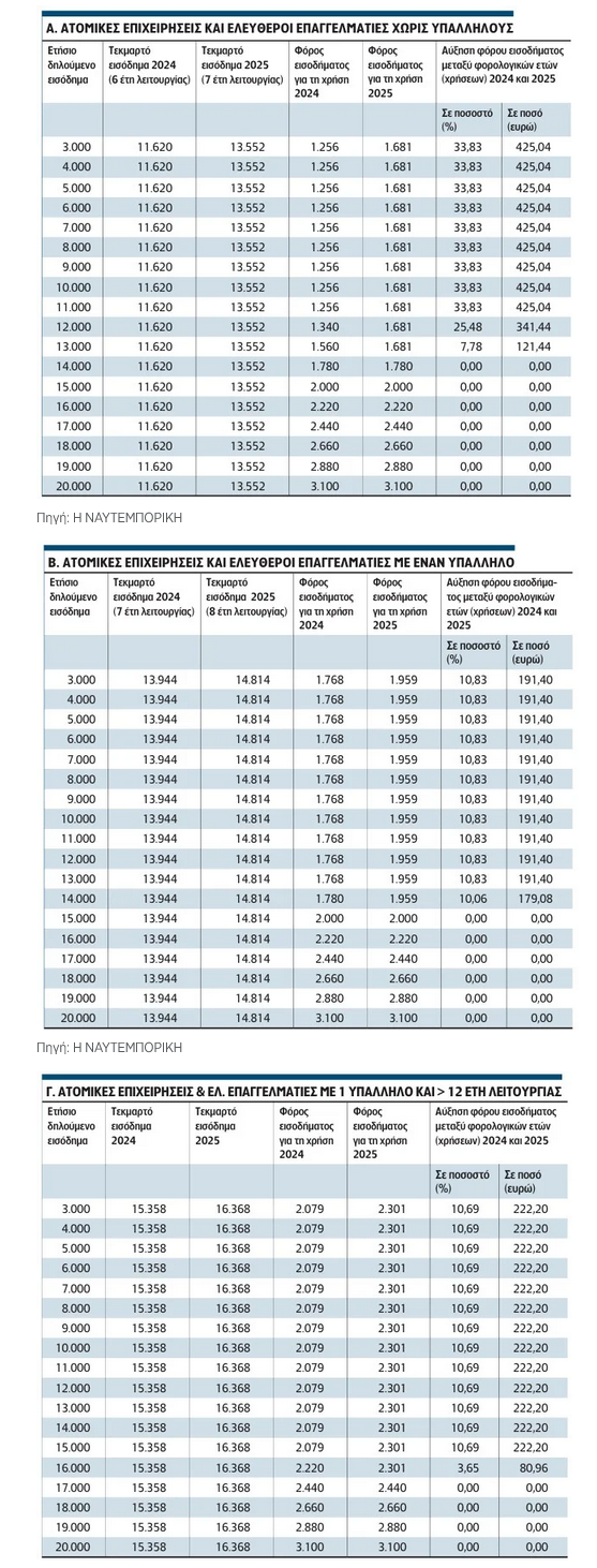 1. Το ύψος του ελάχιστου τεκμαρτού φορολογητέου εισοδήματος για κάθε αυτοαπασχολούμενο που έχει συμπληρώσει έξι έτη άσκησης του επαγγέλματός του και δεν έχει κανέναν υπάλληλο εργαζόμενο στην ατομική επιχείρησή του, είναι ίσο με τον εκάστοτε ισχύοντα ετήσιο μικτό κατώτατο μισθό του ιδιωτικού τομέα. Για τα εισοδήματα του φορολογικού έτους 2024, για τα οποία οι δηλώσεις ήδη υποβάλλονται και οι φόροι έχουν αρχίσει να εκκαθαρίζονται και θα πρέπει να καταβληθούν φέτος, το ύψος του ελάχιστου τεκμαρτού φορολογητέου εισοδήματος της παραπάνω περίπτωσης ανέρχεται σε 11.620 ευρώ (830 ευρώ x 14 μήνες καταβολής του μισθού μέσα στο έτος 2024). Το ποσό αυτό αποτελεί τη βάση υπολογισμού των ελάχιστων τεκμαρτών φορολογητέων εισοδημάτων του φορολογικού έτους 2024 και για τους υπόλοιπους αυτοαπασχολούμενους. Για τα εισοδήματα του φορολογικού έτους 2025, για τα οποία οι φόροι θα εκκαθαριστούν και θα πρέπει να καταβληθούν το 2026, το ύψος του ελάχιστου τεκμαρτού φορολογητέου εισοδήματος της παραπάνω περίπτωσης θα αυξηθεί στα 12.320 ευρώ (880 ευρώ x 14 μήνες καταβολής του μισθού μέσα στο έτος 2025). Το ποσό αυτό θα αποτελέσει τη βάση υπολογισμού των ελάχιστων τεκμαρτών φορολογητέων εισοδημάτων του φορολογικού έτους 2025 και για τους υπόλοιπους αυτοαπασχολούμενους.