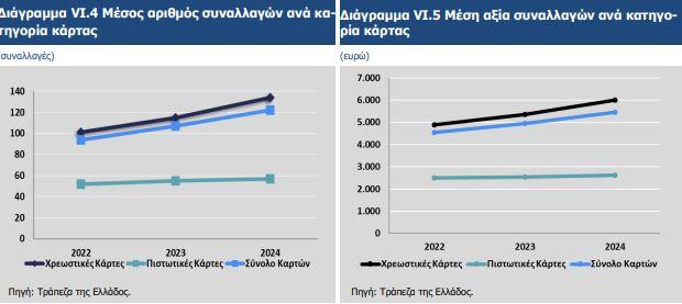 Ο αριθμός των συναλλαγών με χρεωστικές κάρτες αυξήθηκε κατά 14% σε 2,325 δισεκατ. το 2024, από 2,042 δισεκατ. το 2023. Οι χρεωστικές κάρτες συμμετέχουν με ποσοστό 93% στο συνολικό αριθμό των συναλλαγών με όλα τα είδη καρτών πληρωμών. Αντίστοιχα, αύξηση παρουσιάζει και ο αριθμός των συναλλαγών με πιστωτικές κάρτες κατά 10%, ο οποίος ανήλθε σε 186 εκατ., από 168 εκατ. το 2023, ενώ το ποσοστό συμμετοχής τους στο συνολικό αριθμό συναλλαγών ανήλθε σε 7%.