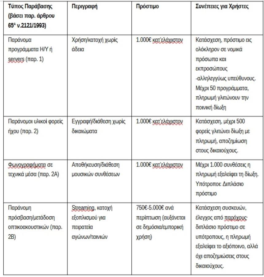 Τα πρόστιμα επιβάλλονται για παραβάσεις όπως παράνομα λογισμικά, συσκευές καταγραφής ήχου, ή και πρόσβαση σε οπτικοακουστικά έργα και εκπομπές από καθημερινούς χρήστες, που παραβιάζουν τα πνευματικά δικαιώματα των νόμιμων δημιουργών και παρόχων. Ακόμα και η «αθώα» παρακολούθηση μέσω streaming ενός αγώνα από παράνομη πλατφόρμα μπορεί να σημαίνει πρόστιμο από 750 ή και 1.000 ευρώ ανάλογα με την παράβαση. Ενώ εκτοξεύεται και σε 5.000 ευρώ ανά περίπτωση, αν γίνεται εμπορική χρήση ή δημόσια αναμετάδοση (π.χ. σε καφετέρια).