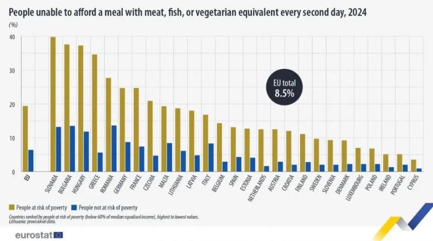 Όπως δείχνουν τα στοιχεία, το 2024, το 8,5% του πληθυσμού της ΕΕ δεν είχε την οικονομική δυνατότητα να αγοράσει ένα γεύμα που περιείχε κρέας, ψάρι ή κάποιο αντίστοιχο χορτοφαγικό γεύμα κάθε δεύτερη μέρα, ποσοστό χαμηλότερο κατά 1,0 ποσοστιαία μονάδα σε σχέση με το 2023 (9,5%).