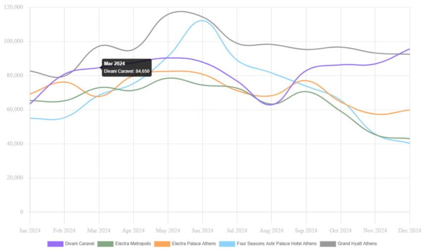 Grand Hyatt Athens – Αναδείχθηκε αδιαμφισβήτητος πρωταγωνιστής της χρονιάς, διατηρώντας την κορυφή σταθερά καθ’ όλη τη διάρκεια του 2024. Η στρατηγική τοποθεσία και η επένδυση στην εμπειρία πολυτέλειας το καθιστούν σημείο αναφοράς.