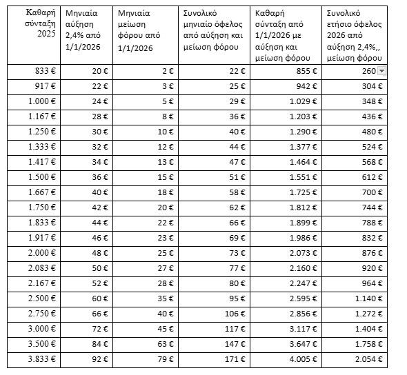 Σύμφωνα με τον σχετικό πίνακα που επεξεργάστηκε και δημοσιεύει το Capital.gr λόγω της αύξησης κατά 2,4%, και της μείωσης της παρακράτησης φόρου στις συντάξεις για το 2026: