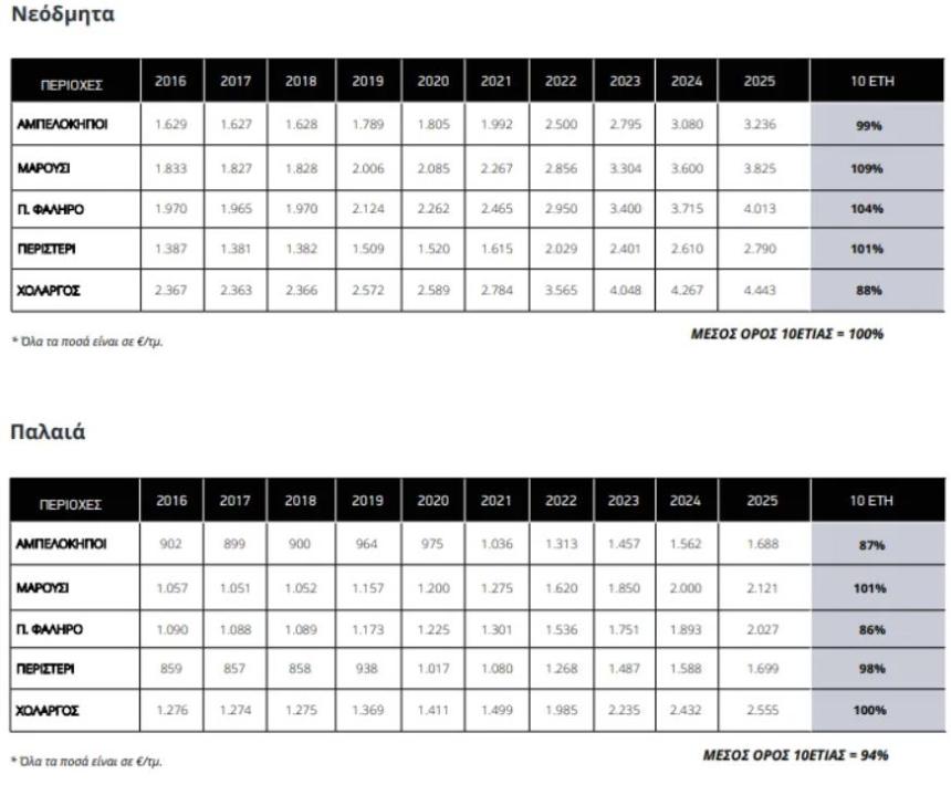 Αποκαλυπτικά είναι τα στοιχεία αν ανατρέξει, μάλιστα, κανείς σε βάθος δεκαετίας, καθώς φαίνεται πως υπάρχει αύξηση κατά μέσο όρο 100% στα νεόδμητα και 94% στα παλαιότερα διαμερίσματα, σε σχέση με τις αξίες του 2016!!! Ενδεικτικά, ένα παλιό διαμέρισμα στο Μαρούσι, με τιμή 1.057 ευρώ/τμ το 2016, έφτασε στα 2.121 ευρώ/τμ το 2025. Όσο για τα νεόδμητα, μια τυπική κατοικία στο Π. Φάληρο, εκτινάχθηκε από τα 1.970 ευρώ/τμ στα 4.013 ευρώ/τμ!