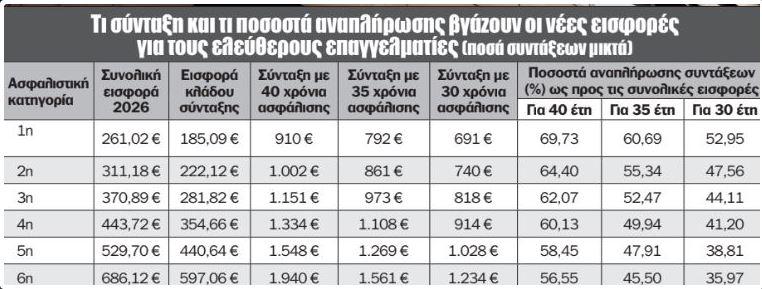 Για 30 χρόνια ασφάλισης η 1η κατηγορία βγάζει σύνταξη με ποσοστό αναπλήρωσης 52,9% ως προς το σύνολο των εισφορών, ενώ με εισφορές στην 6η κατηγορία για 30 χρόνια το ποσοστό αναπλήρωσης πέφτει στο 35,9%.