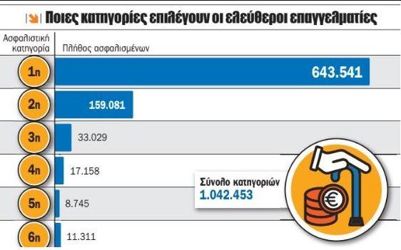 Οι 8 στους 10 επαγγελματίες πληρώνουν την 1η και 2η κατηγορία και μόλις 2 στους 10 τις υψηλότερες. Η επιλογή, όμως, του χαμηλού ασφαλίστρου από τους ελεύθερους επαγγελματίες σημαίνει και συνειδητή επιλογή χαμηλής σύνταξης για πάντα.