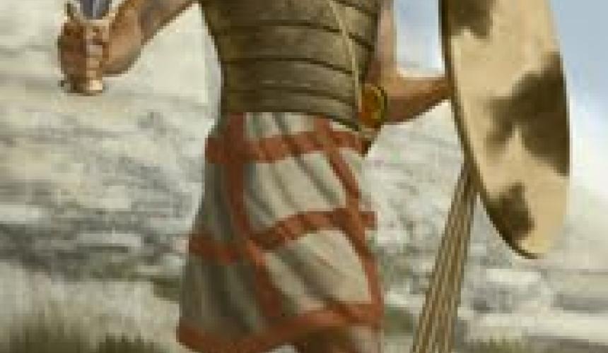 «Γύρω στο 1175 π.Χ. οι Φιλισταίοι (Φιλιστιείμ της Παλαιάς Διαθήκης), οι «Puleseta» [p-l-s-t-] των αιγυπτιακών πηγών, πιθανότατα αιγαιακής (μινωικής;) καταγωγής, οπλισμένοι με τα πιο σύγχρονα μέσα και ικανότατοι πολεμιστές αλλά και γνώστες της πυροτεχνολογίας και της μεταλλοτεχνίας, εγκαταστάθηκαν στην περιοχή που ονομάστηκε από αυτούς Παλαιστίνη. Σύμφωνα με τη βιβλική παράδοση, οι Φιλισταίοι οργανώθηκαν σε μια χαλαρή ομοσπονδία που αποτελείτο από πέντε πόλεις: τη Γάζα, την Ασκαλών(α), την Άζωτο, τη Γαθ και την Εκρών. (…) «…ο Γολιάθ χαρακτηρίζεται ως "απερίτμητος" (χωρίς περιτομή), άρα δεν ήταν σημιτικής καταγωγής. Αυτή η μορφή[7] μοιάζει εκπληκτικά σαν να έχει ξεπηδήσει μέσα από την «Ιλιάδα» του Ομήρου. Ο Γολιάθ μπορεί θαυμάσια να είχε πολεμήσει στις τάξεις των Αχαιών Ελλήνων ή των Τρώων έξω από τα τείχη της θρυλικής πόλης. (…) «Αρκεί ωστόσο να ενθυμηθεί κανείς την αρχική πατρίδα των «Λαών της Θάλασσας» (την Ελλάδα και το Αιγαίο), μερικοί από τους οποίους εγκαταστάθηκαν στη Φιλισταία, για να λυθεί κάθε μυστήριο σχετικά με την παρουσία ενός τέτοιου στρατιώτη στην Παλαιστίνη».