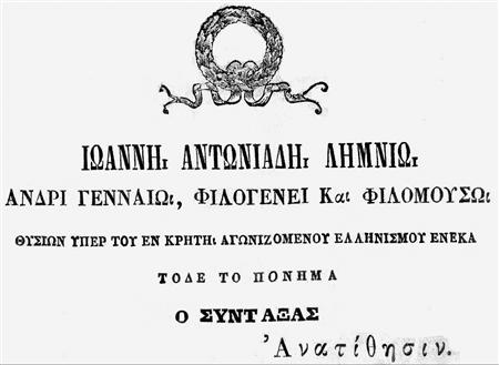 Συντάξας το ανά χείρας κοινωνικόν βιβλίον και επιθυμήσας να πληρώσω ως Κρης ελάχιστον προς Σε μέρος των - προς την δύστηνον πατρίδα μου Κρήτην υπέρ του ελληνισμού αγωνιζομένην - γενναίων και μεγάλων θυσιών Σου, έκρινα δίκαιον και πρέπον να θέσω εν αρχή τούτου το όνομά Σου, φρονών ότι οι αγαθοί και φιλοπάτριδες άνδρες δικαιούνται να έχωσι την της αρετής αυτών αμοιβήν … κλπ. κλπ.