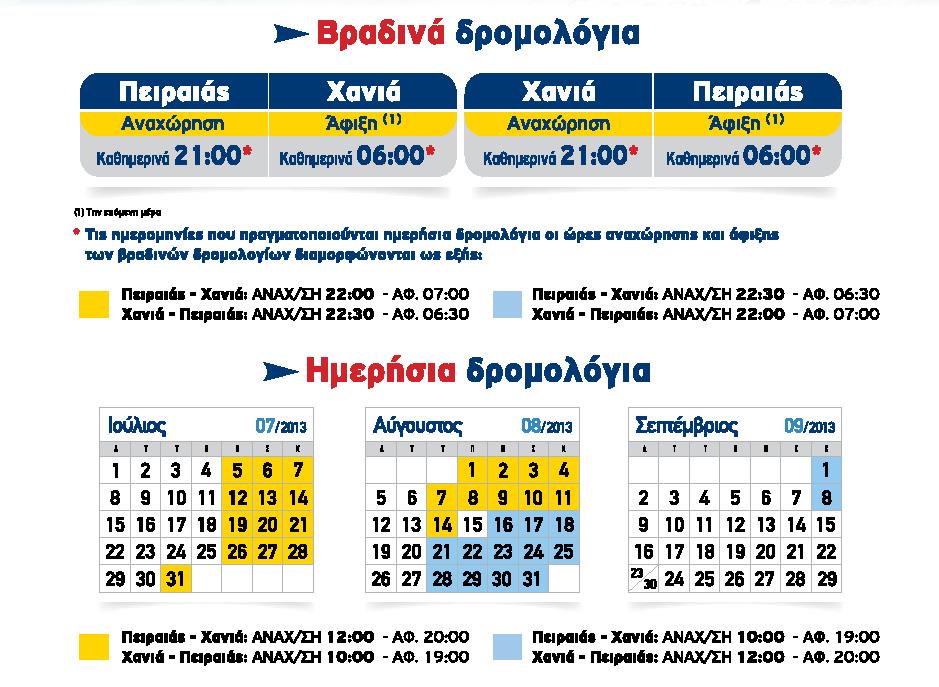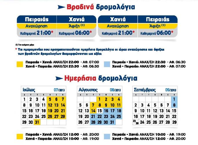 Αναλυτικά, η ΑΝΕΚ και φέτος από τις 5 Ιουλίου έως τις 8 Σεπτεμβρίου 2013 ενδυναμώνει με 74 ημερήσια δρομολόγια την γραμμή των Χανίων, πραγματοποιώντας, ταυτόχρονα, κάθε βράδυ και τις αναχωρήσεις από & προς Πειραιά.