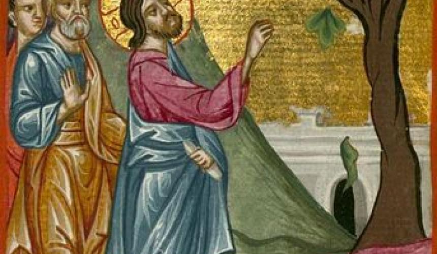 Καὶ τῇ ἐπαύριον ἐξελθόντων αὐτῶν ἀπὸ Βηθανίας ἐπείνασε• καὶ ἰδὼν συκῆν ἀπὸ μακρόθεν ἔχουσα φύλλα, ἦλθεν εἰ ἄρα τι εὑρήσει ἐν αὐτῇ• καὶ ἐλθὼν ἐπ’ αὐτὴν οὐδὲν εὗρεν εἰ μὴ φύλλα• οὐ γὰρ ἦν καιρὸς σύκων, καὶ ἀποκριθεὶς εἶπεν αὐτῇ• μηκέτι ἐκ σοῦ εἰς τὸν αἰῶνα μηδεὶς καρπὸν φάγοι. Καὶ ἤκουον οι μαθηταὶ αὐτοῦ. (Mκ 11:12-14).