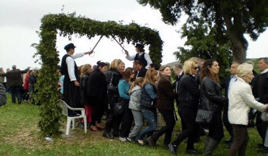 Ο χορός περνά κάτω από δάφνινη αψίδα, όπου υπάρχουν δύο παλικάρια με υψωμένα σπαθιά, και στη μέση του τραγουδιού διπλώνεται στα δύο, με τους χορευτές να περνούν ο ένας απέναντι από τον άλλο για τον τελευταίο χαιρετισμό. Κατά τη διάρκεια της γιορτής μοιράζεται καφές που βράζει σε μεγάλο καζάνι «ζωγραφίτικος», τσουρέκια και αυγά.