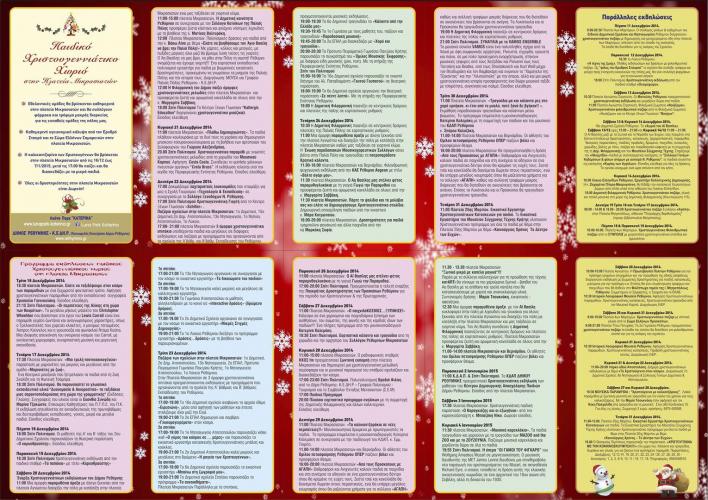 10:30 Ιστορικό Λαογραφικό Μουσείο Ρεθύμνου. Αφήγηση Χριστουγεννιάτικων παραμυθιών. Χριστουγεννιάτικες κατασκευές. Χριστουγεννιάτικα τραγούδια από τον Μουσικό Καρπό. Διοργάνωση ΙΛΕΡ.