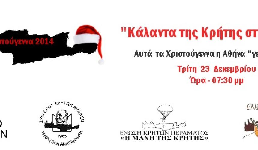 Το Δίκτυο Κρητών, η Ένωση Κρητών Νέας Σμύρνης, ο σύλλογος κρητών αιγάλεω και ο Συλλογος Κρητων Περαματος"η Μαχη Της Κρητης" ενώνουν τις δυνάμεις τους σε μια παράλληλη πρωτοβουλία το απόγευμα της Τρίτης 23 Δεκεμβρίου (7:30μμ) στην Πλατεία της Νέας Σμύρνης, την Πλατεία Ηρώων στο Πέραμα και την Πλατεία Εσταυρωμένου στο Αιγάλεω, για να χαρίσουν στους κατοίκους της πόλης μία εορταστική αίσθηση Κρήτης, με χριστουγεννιάτικο κρητικό κέρασμα και κρητικά παραδοσιακά κάλαντα με τη συνοδεία κρητικής μουσικής.