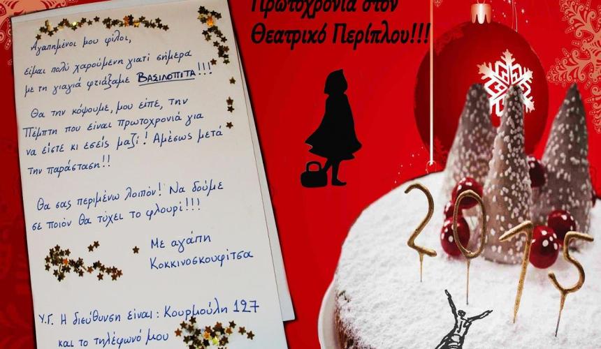 Η γιορτή συνεχίζεται στον Θεατρικό Περίπλου!! Ελάτε μαζί με την Κοκκινοσκουφίτσα να κόψουμε τη Βασιλόπιτα και να καλωσορίσουμε τον καινούριο χρόνο!! Εφοδιαστείτε με χαμόγελα, φρεσκάρετε στο μυαλό σας τα κάλαντα, γιατί όλο και κάπου θα χρειαστούν, και ετοιμαστείτε για την ΠΙΟ ΓΙΟΡΤΙΝΗ ΠΑΡΑΣΤΑΣΗ ΤΗΣ ΧΡΟΝΙΑΣ!!!