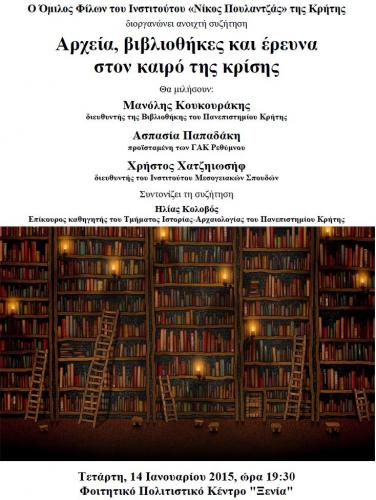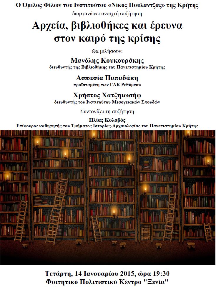 Ο Όμιλος Φίλων του Ινστιτούτου «Νίκος Πουλαντζάς» Κρήτης διοργανώνει ανοιχτή συζήτηση με θέμα «Αρχεία, βιβλιοθήκες και έρευνα στον καιρό της κρίσης»
