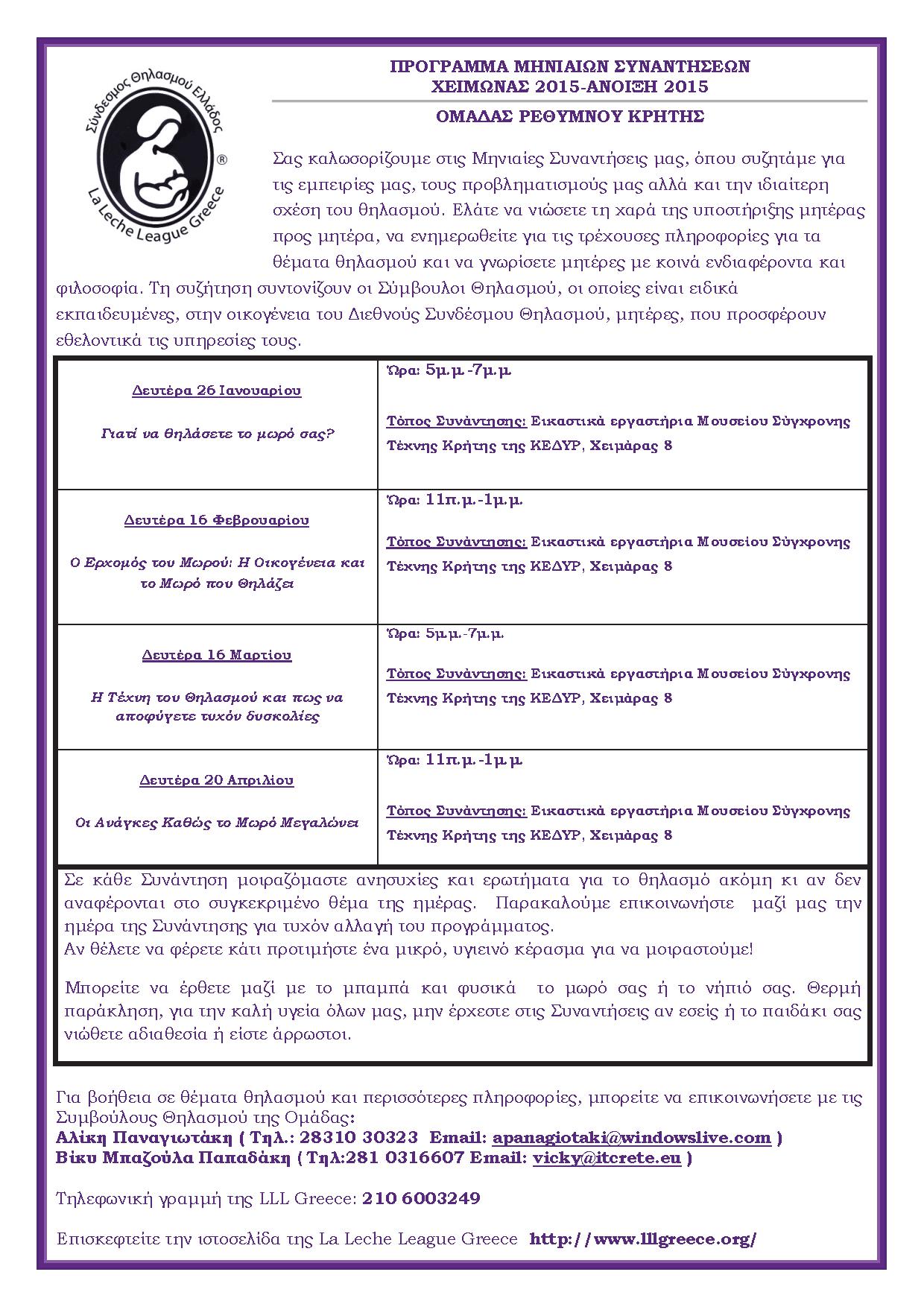 Ξεκινούν και στη πόλη του Ρεθύμνου οι Μηνιαίες Ενημερωτικές Συναντήσεις του Συνδέσμου Θηλασμού Ελλάδος LA LECHE LEAGUE GREECE.Ο Σύνδεσμος Θηλασμού Ελλάδος - La Leche League Greece [προφέρεται Λα Λέτσε Λιγκ] (www.lllgreece.org) είναι ένα μη κερδοσκοπικό Σωματείο και εκπροσωπεί στην Ελλάδα το Διεθνή Σύνδεσμο Θηλασμού La Leche League International (www.llli.org).