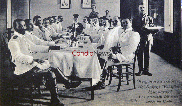 Οι πρώτοι Έλληνες αξιωματικοί που έφτασαν στην Κρήτη ποζάρουν στο φακό. Η φωτογραφία έγινε καρτ ποστάλ που κυκλοφόρησε την εποχή εκείνη