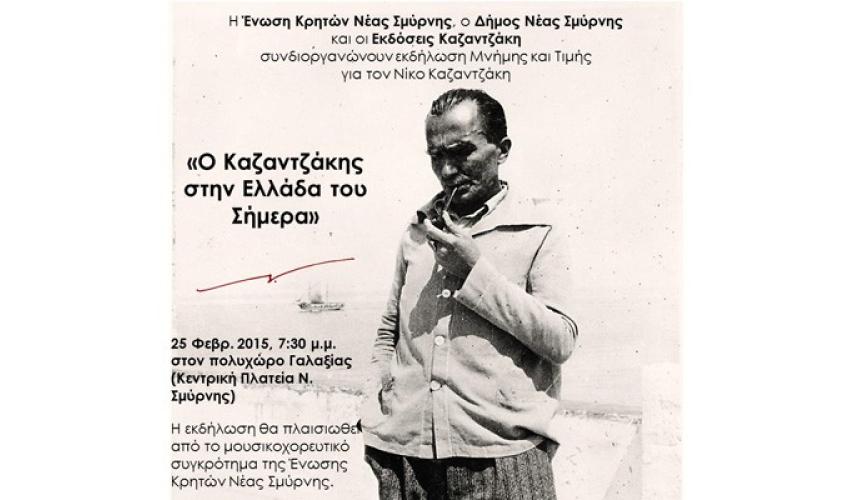 Στις 25 Φεβρουαρίου 2015, με αφορμή την 132η επέτειο από τη γέννηση του Νίκου Καζαντζάκη, η Ένωση Κρητών Νέας Σμύρνης, ο Δήμος Νέας Σμύρνης και οι Εκδόσεις Καζαντζάκη συνδιοργανώνουν εκδήλωση Μνήμης και Τιμής με τίτλο: «Ο Καζαντζάκης στην Ελλάδα του Σήμερα».