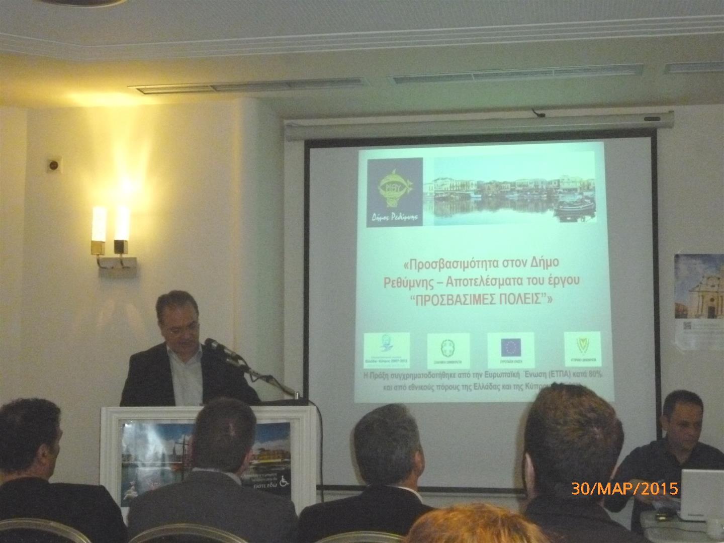 Στη συνέχεια, ο Αντιδήμαρχος κ. Τάσος Παπαδουράκης παρουσίασε τα έργα που υλοποίησε ο Δήμος μας στο πλαίσιο του συγκεκριμένου Προγράμματος όπως: α) Προμήθεια εξοπλισμού πρόσβασης και εξυπηρέτησης αναγκών ΑμεΑ σε παραλίες του Δήμου, β) προμήθεια συστημάτων ηχητικής ειδοποίησης ατόμων με προβλήματα όρασης σε υφιστάμενους σηματοδότες γ) έργα βελτίωσης προσβασιμότητας ΑμεΑ στο Γενικό Νοσοκομείο Ρεθύμνης και δ) εργασίες προσβασιμότητας ΑμεΑ στη δημοτική πινακοθήκη Κανακάκη, η οποία ολοκληρώθηκε στο τέλος του 2014. Σε αυτά προστίθενται έργα προσβασιμότητας στο Φρούριο Φορτέτζας, η έκδοση προσβάσιμου τουριστικού οδηγού για τον Δήμο Ρεθύμνης και η προμήθεια και τοποθέτηση ενημερωτικών πινακίδων για τις παραπάνω παρεμβάσεις.