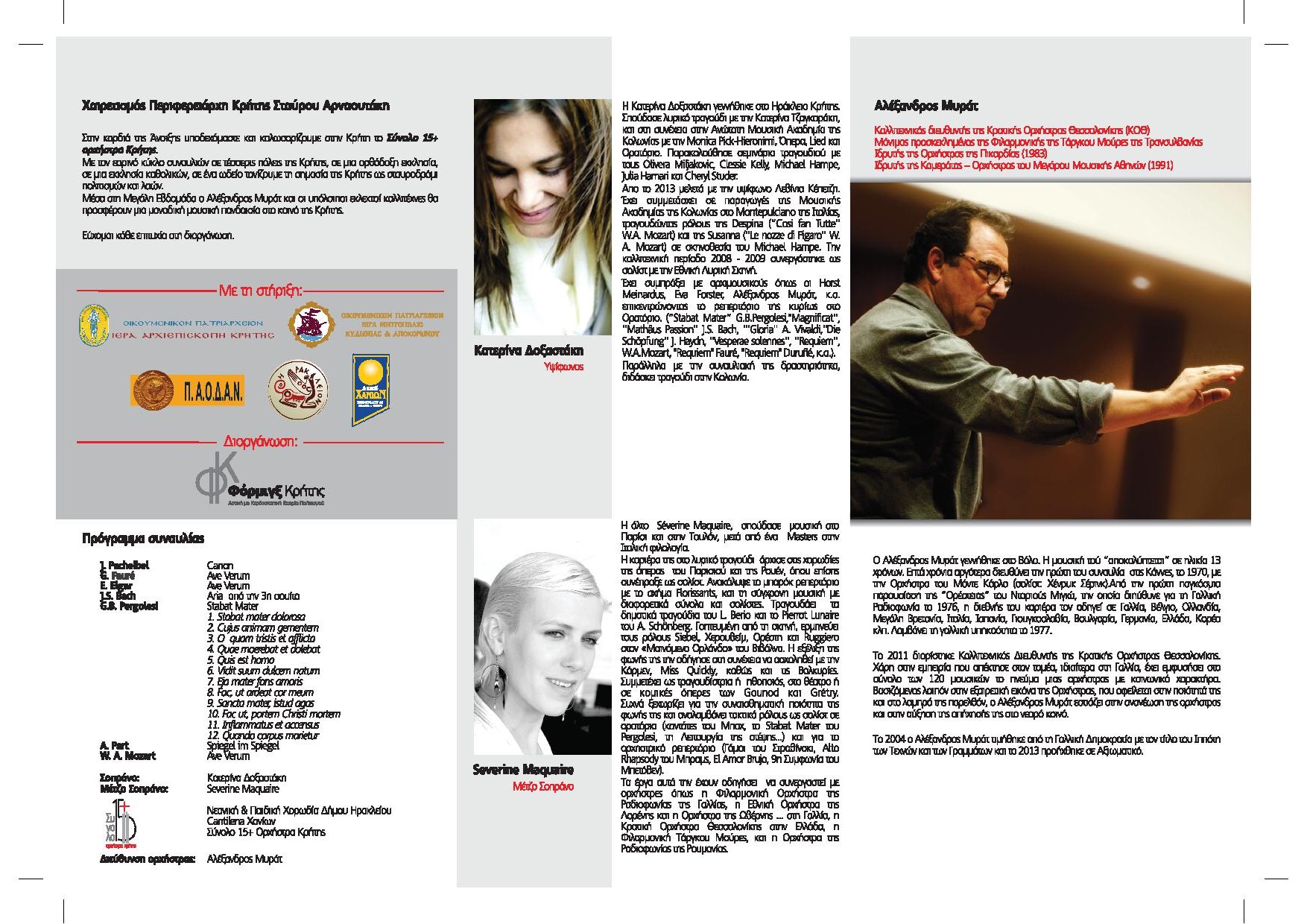 Η υψίφωνος Κατερίνα Δοξαστάκη μιλώντας για τις συναυλίες εξέφρασε την χαρά της για την συμμετοχή της στις συναυλίες και «θα χαρώ παρά πολύ να συμπράξω με τον κ. Μυράτ, την χορωδία του δήμου Ηρακλείου υπό την διεύθυνση του Γιάννη Ιδομενέως, και της «Cantilena» Χανίων υπό την διεύθυνση του Γιώργου Καλούτση».