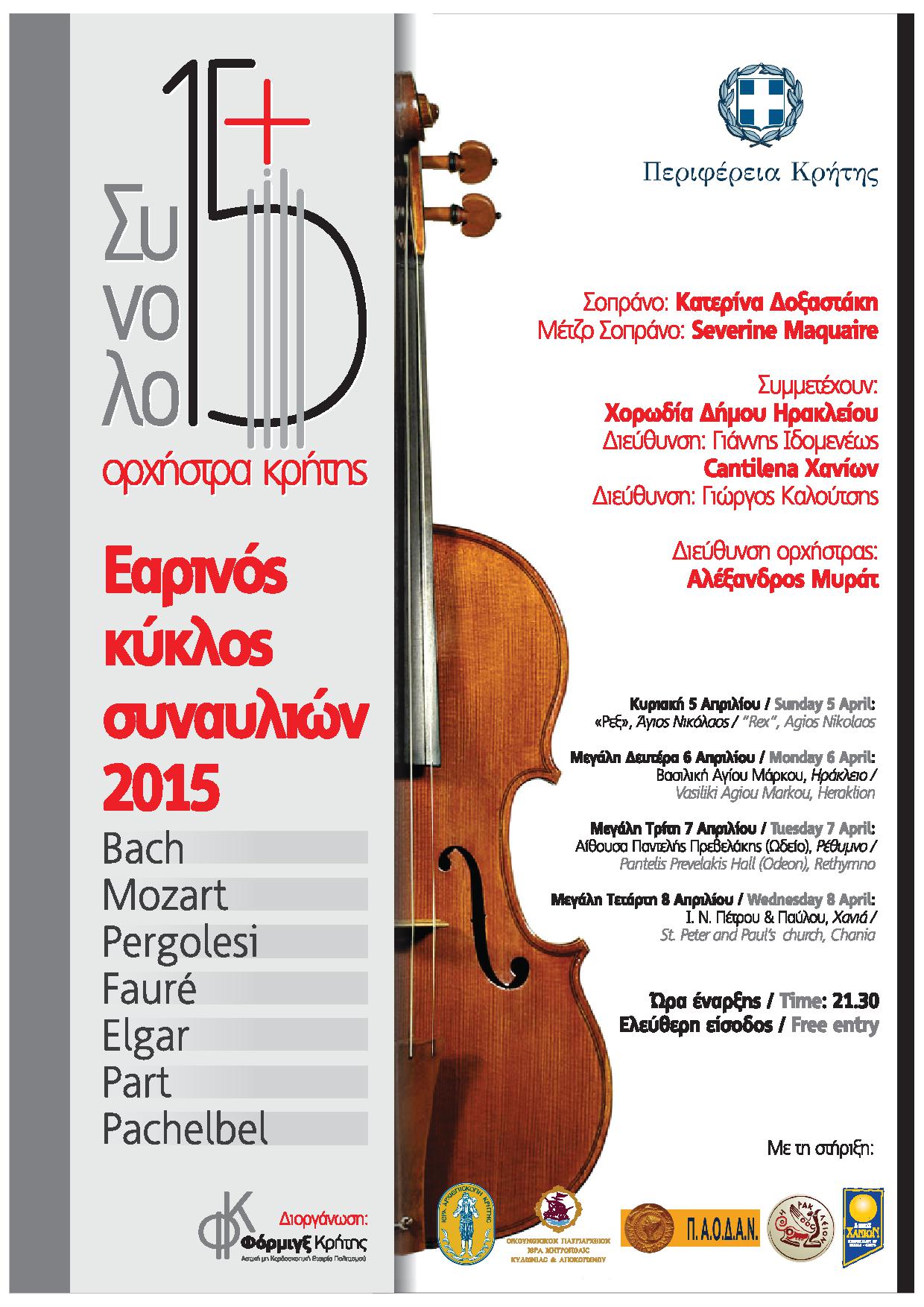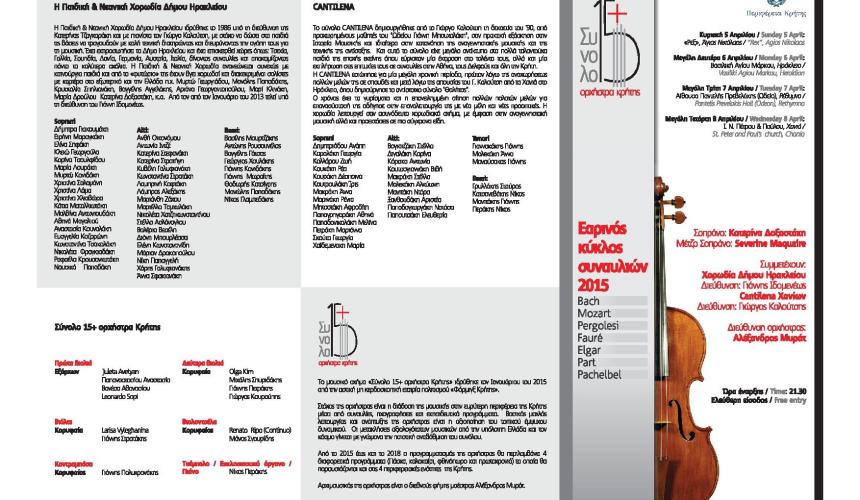 Ο καλλιτεχνικός διευθυντής «Σύνολο 15+Ορχήστρα Κρήτης Νίκος Περράκης τέλος είπε: «Η Κρήτη πιστεύω ότι έχει μια ορχήστρα κάτω από τις «φτερούγες» της Περιφέρειας Κρήτης και της θερμής υποστήριξης του Περιφερειάρχη Σταύρου Αρναουτάκη. Πιστεύω ότι όλοι θα ανταποκριθούμε σε αυτό το κάλεσμα, το κοινό της Κρήτης σίγουρα θα «αγκαλιάσει» αυτή την προσπάθεια, που εύχομαι να συνεχιστεί». Όλες οι συναυλίες θα ξεκινήσουν στις 21.30 με ελεύθερη είσοδο για το κοινό. Το πρόγραμμα περιλαμβάνει έργα φωνητικής και ορχηστρικής μουσικής των W. A. Mozart, J.S. Bach, G.B. Pergolesi, E. Elgar, G. Faure, J. Pachelbel και A. Part.