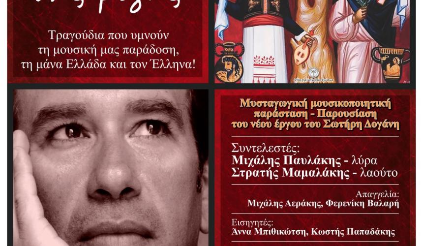 Ο Σύνδεσμος Διαδόσεως Καλών Τεχνών – Ελληνικό Ωδείο Ρεθύμνου διοργανώνει την Κυριακή 19 Απριλίου 2015 και ώρα 19:30 στην αίθουσα Παντελή Πρεβελάκη (Ωδείο) μια μυσταγωγική μουσικοποιητική παράσταση «Με τα Φτερά της Ρίζας». Πρόκειται για την παρουσίαση του νέου δισκογραφικού έργου του Ρεθύμνιου καλλιτέχνη Σωτήρη Δογάνη που κυκλοφόρησε πρόσφατα από τις Μουσικές εκδόσεις «Σείστρον».