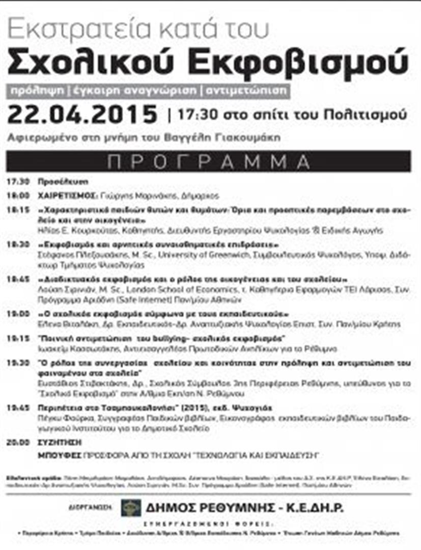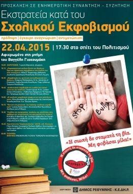 Μια εκδήλωση με θέμα το bullying, αφιερωμένη στο Βαγγέλη Γιακουμάκη πραγματοποιείται στις 22 Απριλίου, στο Σπίτι του Πολιτισμού, στο Ρέθυμνο. Η εκδήλωση με τίτλο "H σιωπή δε σταματά τη βία! Μη φοβάσαι μίλα!" θα ξεκινήσει στις 17. 30.