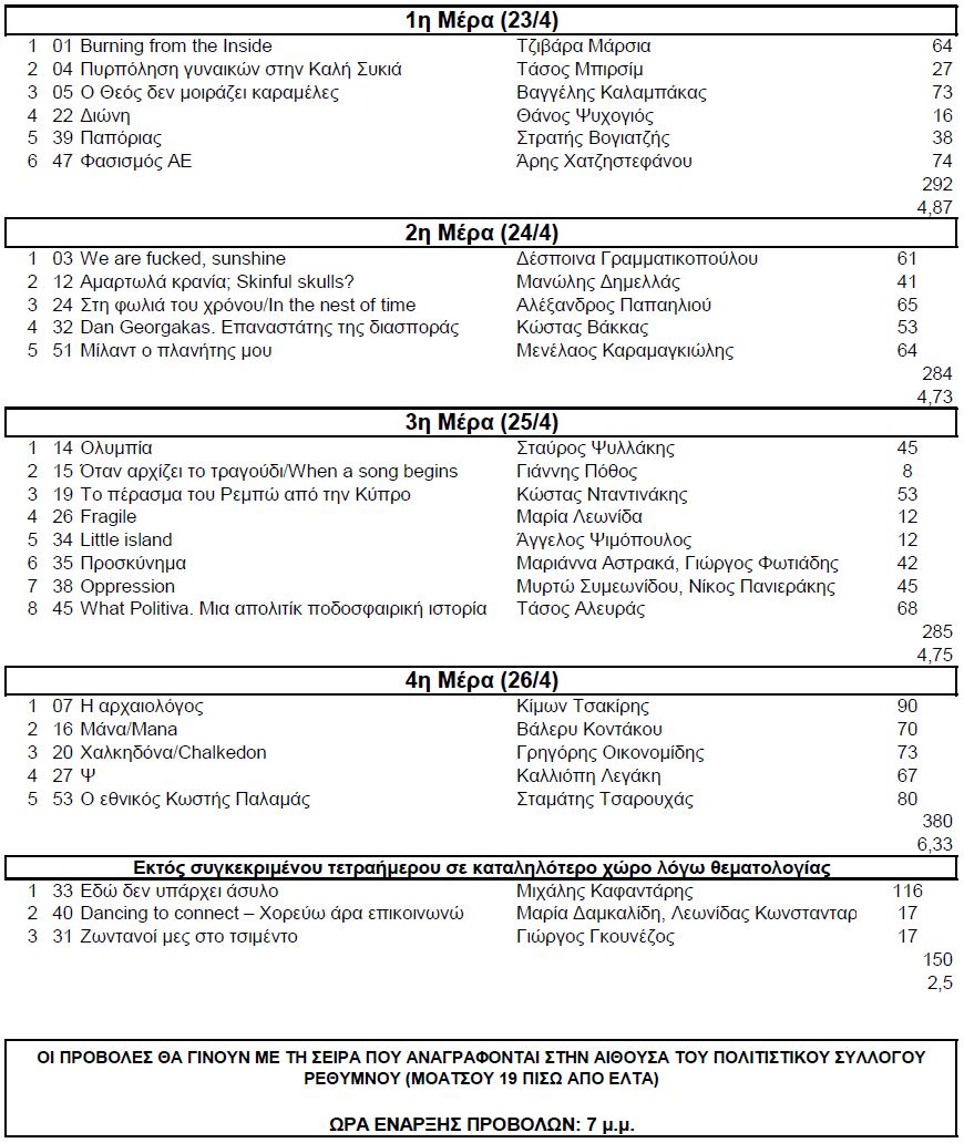 Η κινηματογραφική λέσχη του Πολιτιστικού Συλλόγου Ρεθύμνου, θα παρουσιάσει το 4ήμερο 23-26 Απρ, στην αίθουσα του συλλόγου [Μοάτσου 19, πίσω από το ταχυδρομείο], μέρος του 17ου Φεστιβάλ Ντοκυμαντέρ Θεσσαλονίκης.