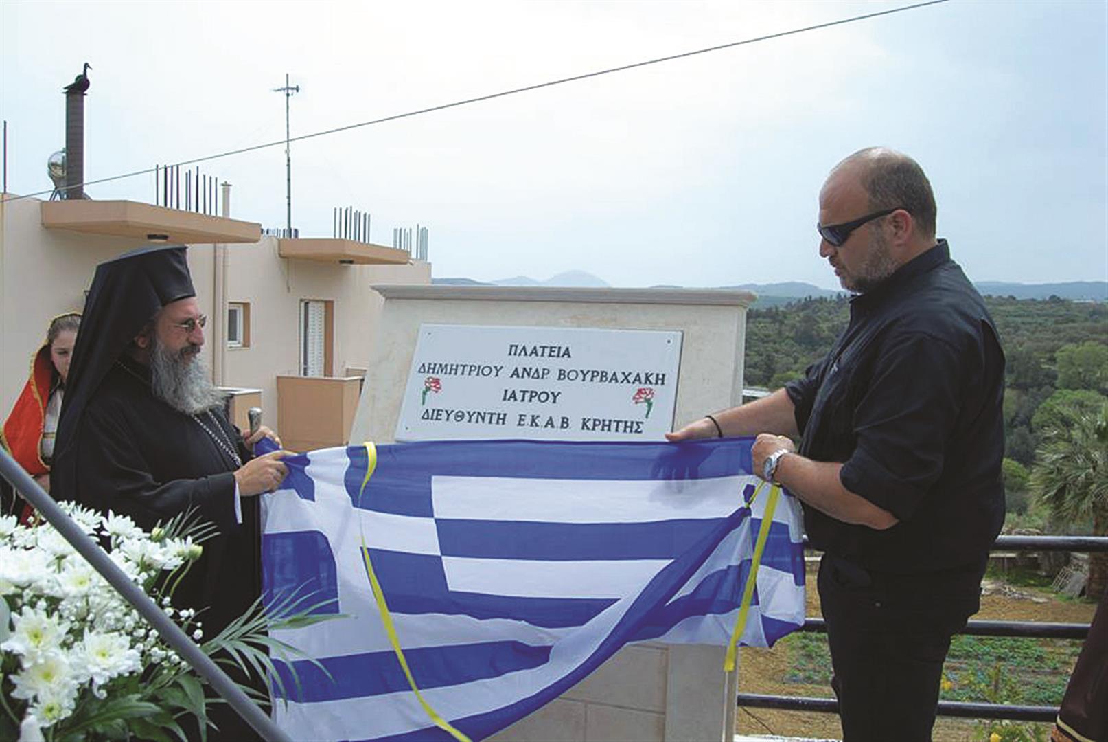 Στην πλατεία όλα ήταν έτοιμα για τη μεγάλη στιγμή, τη στιγμή που θα γινόταν η ονοματοδοσία της κεντρικής πλατείας του χωριού, σε πλατεία Δημήτρης Βουρβαχάκης. Αρχικά τελέσθηκε επιμνημόσυνος δέηση μπροστά από τη μαρμάρινη πλάκα, που έχει τοποθετηθεί σε μια όμορφη βάση και ήταν σκεπασμένη, με την ελληνική σημαία ως είθισται. Η δραστήρια πρόεδρος του Συλλόγου κ. Γιάννα Σταυρουλάκη - Κιμιωνή καλωσόρισε τον κόσμο που τίμησε με την παρουσία του, αυτή τη λιτή όπως τη χαρακτήρισε εκδήλωση. Μια εκδήλωση όμως που ετοίμασαν με πολύ αγάπη για το δικό τους άνθρωπο, που έφυγε τόσο πρόωρα και με τραγικό τρόπο. Ακολούθησαν οι χαιρετισμοί των επισήμων που μεταξύ άλλων ανέφεραν: