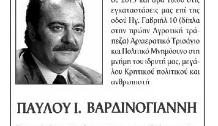 Ο Όμιλος των Βρακοφόρων της Κρήτης διοργανώνει τις εφετινές επετειακές εκδηλώσεις για τα 90 χρόνια από τη γέννηση του ιδρυτή του, μεγάλου πολιτικού και ανθρωπιστή Παύλου Ι. Βαρδινογιάννη. Η έναρξη των εκδηλώσεων θα γίνει την Κυριακή 3 Μαΐου (ο Παύλος είχε φύγει από κοντά μας στις 4 Μαΐου 1984) με αρχιερατικό μνημόσυνο που θα τελεστεί από τον σεβασμιώτατο Μητροπολίτη Ρεθύμνης και Αυλοποτάμου κ.κ. Ευγένιο στις εγκαταστάσεις του Ομίλου Βρακοφόρων «Παύλος Ι. Βαρδινογιάννης» και ώρα 18:00. Επίσης θα πραγματοποιηθεί και πολιτικό μνημόσυνο με ομιλία και προβολή βίντεο και εικόνων από τη ζωή και το έργο του αξέχαστου Παύλου.