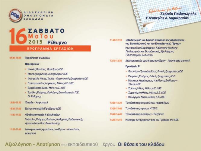 Παγκρήτια ημερίδα διοργανώνει ο Σύλλογος Εκπαιδευτικών Ρεθύμνου σε συνεργασία με τη ΔΟΕ, το Σάββατο 16 Μαίου 2015.