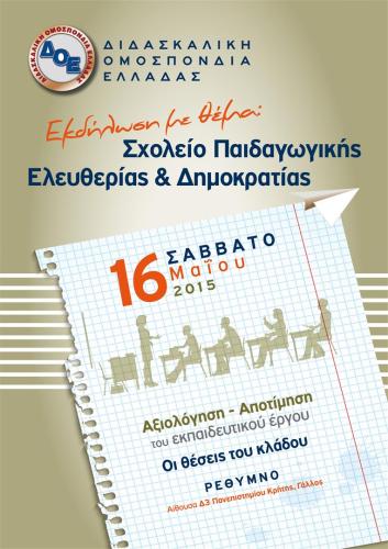 Το Δ.Σ. της Δ.Ο.Ε. σε συνεργασία με το Σύλλογο Εκπαιδευτικών Πρωτοβάθμιας Εκπαίδευσης Ν. Ρεθύμνης, θα πραγματοποιήσουν το Σάββατο 16 Μαΐου 2015 και από ώρα 09:00 έως 15:00 επιστημονική εκδήλωση με θέμα: ΣΧΟΛΕΙΟ ΠΑΙΔΑΓΩΓΙΚΗΣ ΕΛΕΥΘΕΡΙΑΣ & ΔΗΜΟΚΡΑΤΙΑΣ Αξιολόγηση – αποτίμηση του εκπαιδευτικού έργου. Οι θέσεις του κλάδου».