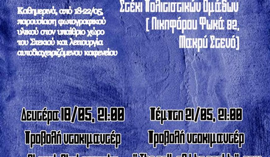 Από τη Δευτέρα 18/05 έως και την Παρασκευή 22/05, από τις 17:30 μέχρι τις 22:00, στο Στέκι Πολιτιστικών Ομάδων (Νικηφόρου Φωκά 82, Μακρύ Στενό).
