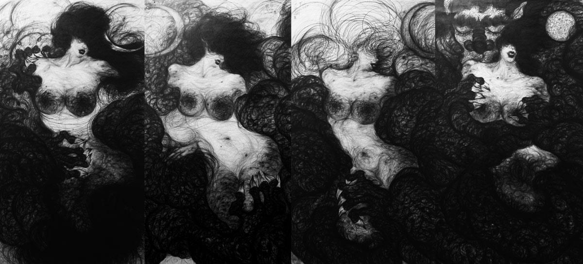 Η πολυετής δουλειά της Park με συνθέσεις που φέρνουν κοντά δράκους και γυναίκες είναι ένα μυστήριο που πλησιάζει στα όρια της εμμονής ή μήπως μπορούμε να την δούμε σαν ένα είδος διαλογισμού; Θέτω το ερώτημα επειδή τα σκίτσα της Park πάνω σε επιφάνειες μνημειώδους κλίμακας απαιτούν τη συνεχή, συγκεντρωμένη προσπάθεια πολλών ημερών ή και εβδομάδων. Μια τόσο λεπτομερής τεχνική σαν τη δική της βρίσκει συνήθως πρόσφορο έδαφος σε μικρότερες επιφάνειες, ακριβώς επειδή απαιτείται τόση δουλειά. Ήδη από την αρχαιότητα, το σχέδιο με λεπτές γραμμές συνδέθηκε με την εκτέλεση δύσκολων λεπτομερειών. Αυτό ίσχυε και στην αρχαία Ελληνική τέχνη όπως μαρτυρεί η ιστορία με τα περίφημα αληθοφανή σταφύλια του ζωγράφου Ζεύξη από τη Θάσο (5ος αι. π.χ.). Ο αριστοτεχνικός χειρισμός της φωτοσκίασης επέτρεψε στο Ζεύξη να εξελίξει την τέχνη του σε άλλο επίπεδο, καθώς οι περισσότεροι ζωγράφοι της εποχής έδιναν έμφαση στο περίγραμμα, κάτι που είχε ως αποτέλεσμα να φαίνονται επίπεδες οι μορφές. Τα σταφύλια του Ζεύξη, αντιθέτως, έμοιαζαν τόσο αληθινά που ξεγελούσαν ως και τα πουλιά, τα οποία έρχονταν να τα τσιμπήσουν. Σε αντίθεση όμως τον αρχαίο ζωγράφο, που δημιουργούσε οπτικές πλάνες μιμούμενος υπαρκτά αντικείμενα, η Park αντλεί έμπνευση από τη φαντασία της.